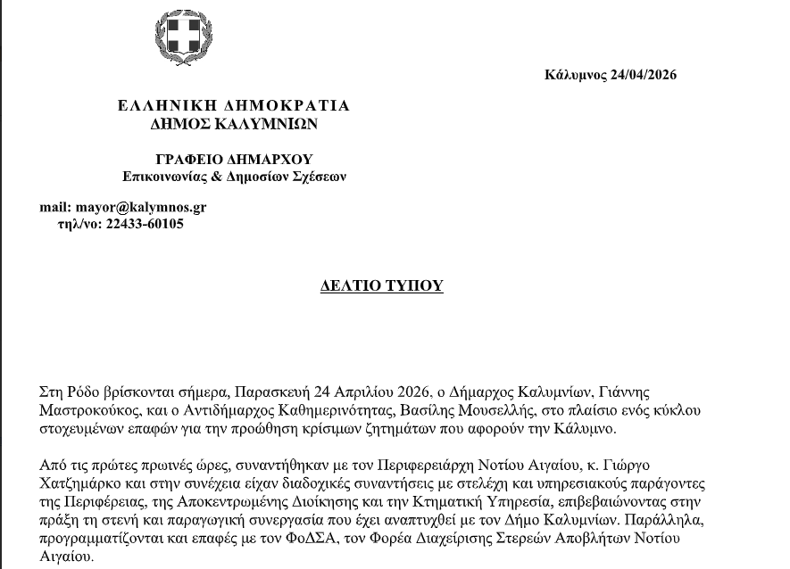 Σειρά σημαντικών επαφών στη Ρόδο πραγματοποιούν σήμερα, Παρασκευή 24 Απριλίου 2026, ο δήμαρχος Γιάννης Μαστροκούκος και ο αντιδήμαρχος Βασίλης Μουσελλής με στόχο την επιτάχυνση διαδικασιών και την προώθηση ζητημάτων που απασχολούν το νησί.