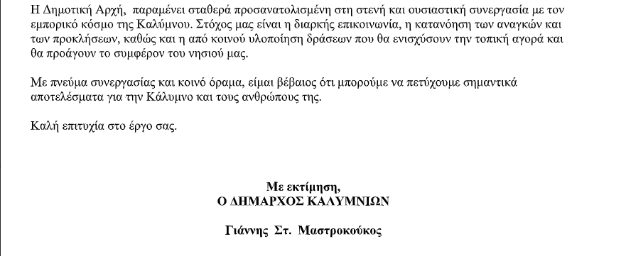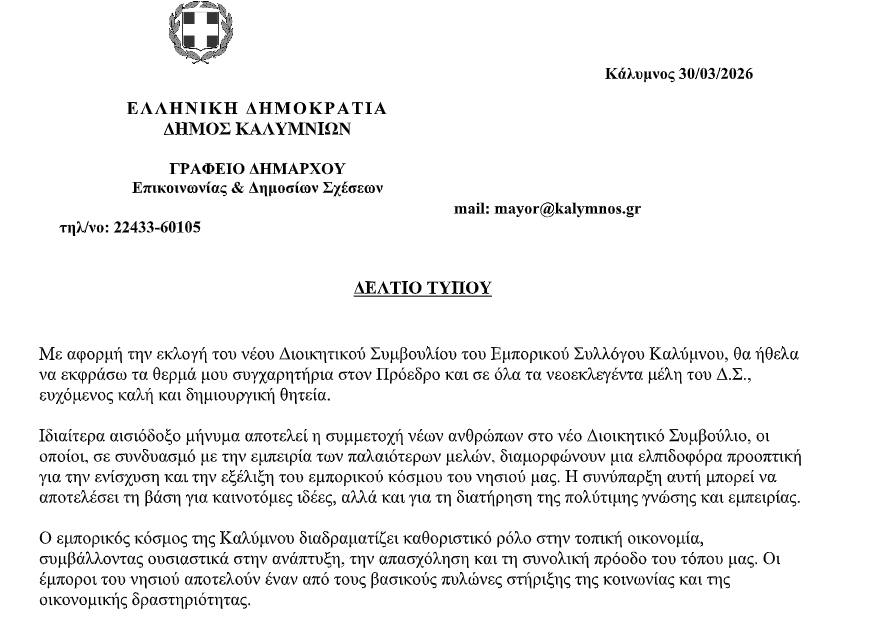 Συγχαρητήριο μήνυμα δημάρχου στο νέο ΔΣ του Εμπορικού συλλόγου Καλύμνου.