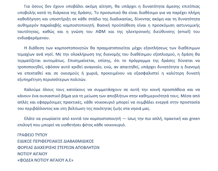 Με στόχο τη διεύρυνση της οικιακής κομποστοποίησης στο νησί, η πρωτοβουλία εντάσσεται σε ένα ευρύτερο πρόγραμμα περιβαλλοντικής ευαισθητοποίησης, προσφέροντας στους πολίτες ένα απλό αλλά ουσιαστικό εργαλείο για πιο βιώσιμη καθημερινότητα. Παράλληλα, εξειδικευμένο προσωπικό θα βρίσκεται στο σημείο για καθοδήγηση, ενώ θα δίνεται και η δυνατότητα επιτόπιας αίτησης και άμεσης παραλαβής, μέχρι εξαντλήσεως των διαθέσιμων τεμαχίων.