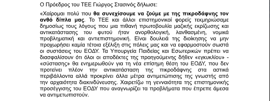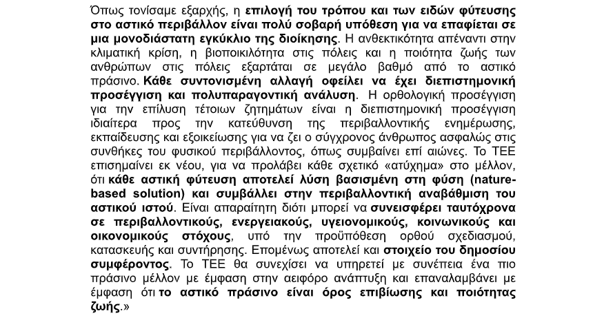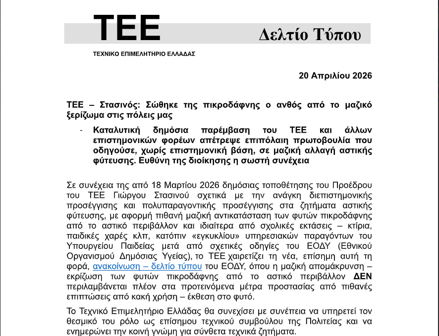Η εξέλιξη αυτή έρχεται ύστερα από έντονες αντιδράσεις και τεκμηριωμένες παρεμβάσεις επιστημονικών φορέων, που ανέδειξαν τους κινδύνους μιας οριζόντιας και μονοδιάστατης προσέγγισης σε ένα σύνθετο ζήτημα αστικής φύτευσης. Ο πρόεδρος του ΤΕΕ, Γιώργος Στασινός, κάνει λόγο για μια σημαντική «νίκη της λογικής», τονίζοντας την ανάγκη οι όποιες παρεμβάσεις στο περιβάλλον των πόλεων να βασίζονται σε ολοκληρωμένη επιστημονική ανάλυση και όχι σε αποσπασματικές διοικητικές οδηγίες