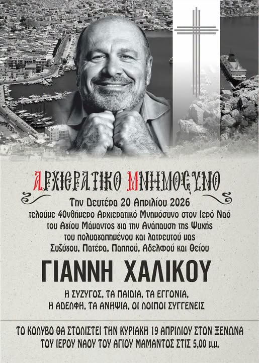 Τη Δευτέρα 20 Απριλίου 2026,πρωί, θα τελεστεί το 40νθήμερο αρχιερατικό μνημόσυνο για την ανάπαυση της ψυχής του πολυαγαπημένου Γιάννη Χαλίκου ,μεγάλου ευεργέτη της Καλύμνου.