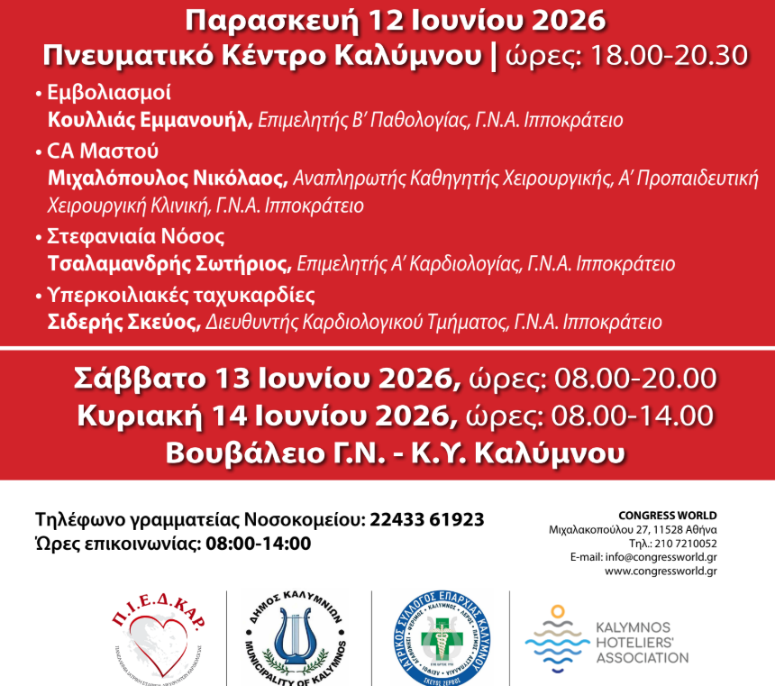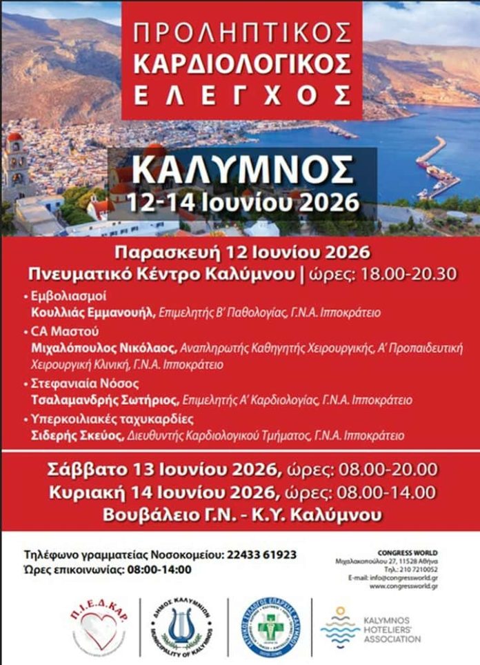 Με έντονο επιστημονικό και κοινωνικό αποτύπωμα επιστρέφει και φέτος στην Κάλυμνο ένα σημαντικό ιατρικό γεγονός, καθώς από τις 12 έως τις 14 Ιουνίου 2026 θα πραγματοποιηθεί επιστημονικό ιατρικό συνέδριο σε συνδυασμό με δράσεις προληπτικού καρδιολογικού ελέγχου για τους πολίτες του νησιού.